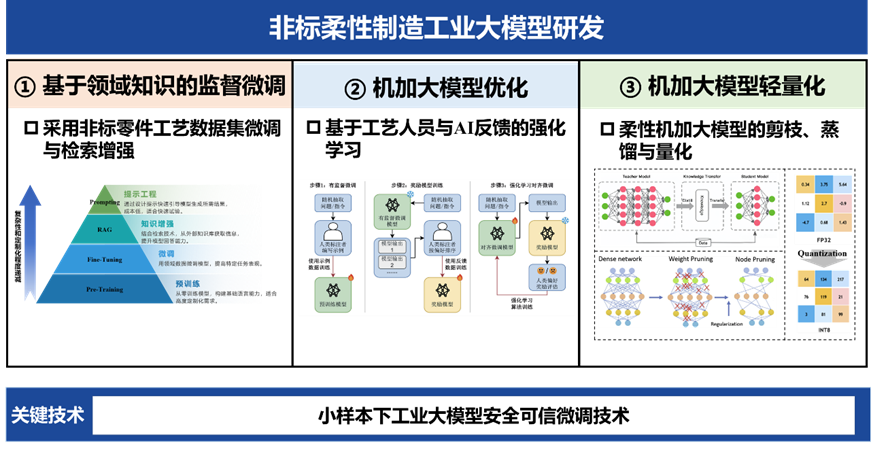 由北京蚂蚁工场智造科技有限公司牵头,北京航空航天大学参与(蔡茂林教授作为项目负责人、仝晓萌教授作为北航课题负责人)的北京市新一代信息通信技术创新专项“面向非标柔性制造的工业大模型研发与示范应用”于2025.12月获批,国拨经费500万,项目执行期为2年。该项目针对非标制造场景复杂多变、现有AI模型可能产生违背物理规律的“幻觉”结果、缺乏柔性的“动态决策”系统等的问题,重点研发“机加零件高质量数据集+非标柔性制造工业大模型+嵌入式轻量级专用化工业算法集+工业智能体”一体化解决方案。